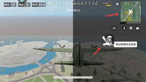 3、登機后滑動降落傘搖桿可轉動視角,結合右上角地圖標記落點,選擇資源豐富區域可提升前期生存概率。