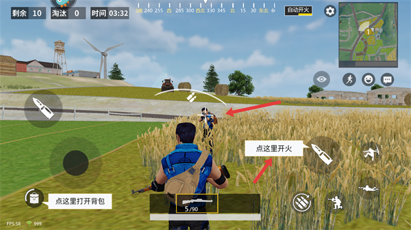 4、落地后點擊背包按鈕可打開物品欄,點擊開火鍵可與敵人交戰,合理利用操作鍵位是競技取勝的基礎。