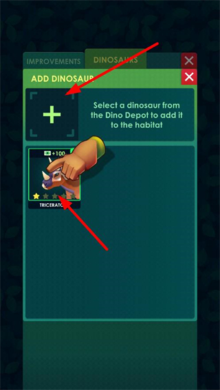 3、從DinoDepot選擇恐龍添加到棲息地,點擊對應恐龍選項,即可將其安置到匹配的棲息地里,完成恐龍的入駐操作。