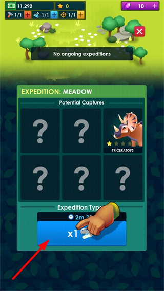 4、界面顯示潛在捕獲的恐龍,點擊對應按鈕即可開啟探險,等待一定時長后,可獲取對應的恐龍或獎勵,豐富棲息地的恐龍種類。
