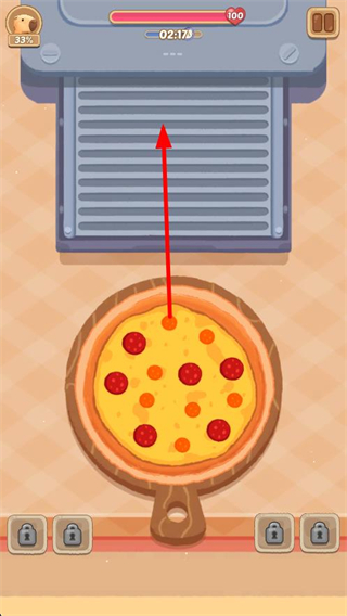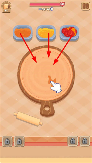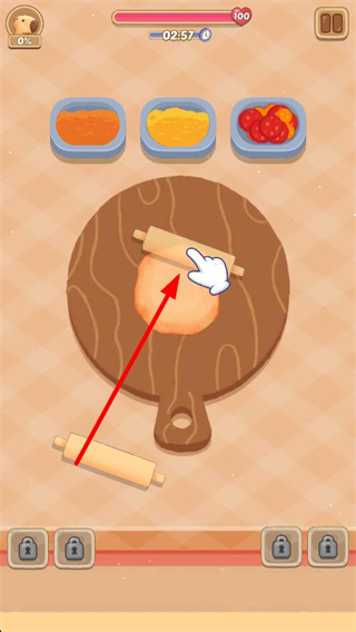 2、在制作界面使用搟面杖處理面團,按指引操作搟面杖,將面團搟成披薩餅底的形狀,完成制作披薩的基礎步驟。