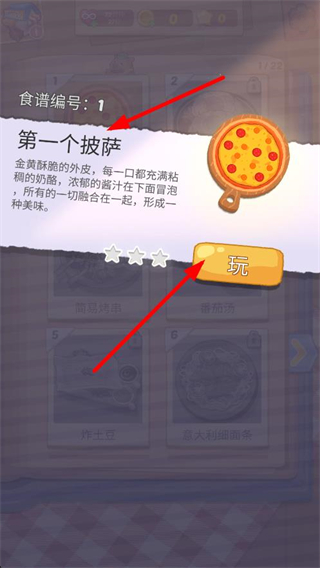 1、選擇食譜編號1的第一個披薩,查看其介紹后點擊玩按鈕,開啟披薩制作流程,準備進行后續的食材處理操作。