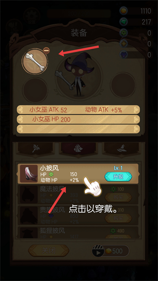 2、在裝備界面點擊小披風可穿戴該裝備,其能提升HP與動物HP屬性,增強角色與伙伴的生存能力。
