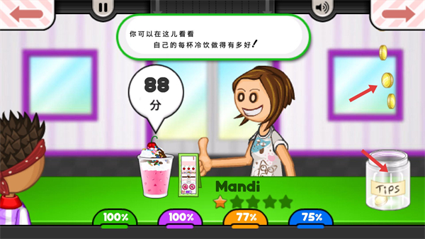 4、完成冷飲制作后會得到評分,同時可獲得金幣獎勵,評分越高獎勵越豐厚,后續可根據評分優化制作流程,提升每杯冷飲的制作質量。