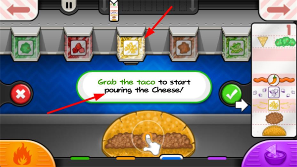 3、準備好牛肉后,抓取taco開始添加配料,點擊對應的Cheese容器,往taco上添加芝士,推進制作步驟。