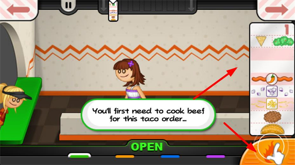 1、看到顧客的taco訂單提示,需要先烹飪牛肉,點擊界面的OPEN按鈕,開啟食材準備的流程。