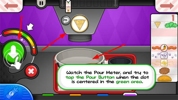 4、添加配料時觀察Pour Meter,當圓點處于綠色區域時,點擊Pour Button完成配料添加,確保制作符合要求。