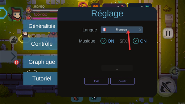 3、設置界面初始顯示為法語,可調整音樂、音效的開關狀態,還能切換語言等配置項。