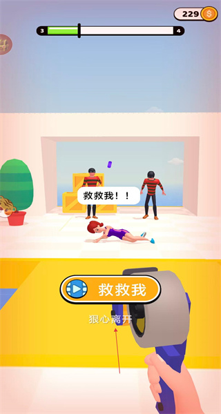 2、推進關卡后進入新場景,看到角色倒地并顯示求救提示,底部有救救我和狠心離開選項,需選擇選項推進游戲。