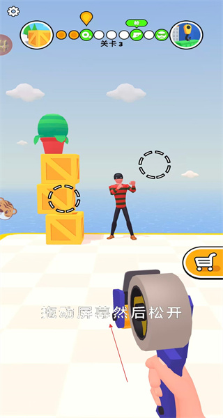 1、進入游戲關卡3,頂部顯示關卡相關標識,底部提示拖動屏幕后松開,準備借助膠帶工具推進關卡進程。