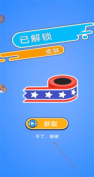 4、完成關卡操作后跳轉至皮膚解鎖頁,顯示已解鎖皮膚樣式,底部有獲取和不了謝謝選項,可選擇對應選項結束當前流程。