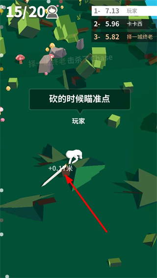 2、砍擊時要瞄準目標,成功擊中后會顯示增加的刀長數值,同時場景里會出現蘑菇等元素,持續砍擊可不斷提升自己的刀長。