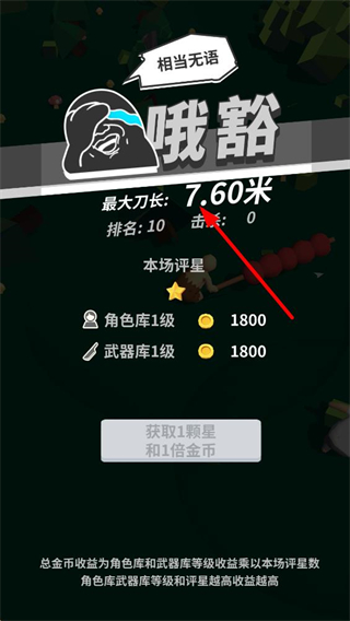 4、對局結束后會顯示本場最大刀長排名等數據,還能獲得金幣獎勵,金幣可用于提升角色庫和武器庫等級,等級越高收益越多。