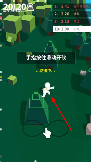 1、進入游戲后手指按住滑動來控制砍擊,同時界面會顯示防御中狀態,上方還能看到其他玩家的排名數據,需專注操作推進進程。