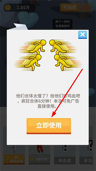 3、若覺得角色合體速度慢,可使用打雞血功能,點擊立即使用后能獲得6分鐘的瘋狂合體加速,本次使用還可免廣告直接生效。