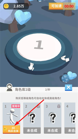 2、角色庫界面消耗金幣購買低等級角色,相同角色會自動合體成高級角色,合體后角色庫等級提升,每秒收益也會隨之增加。