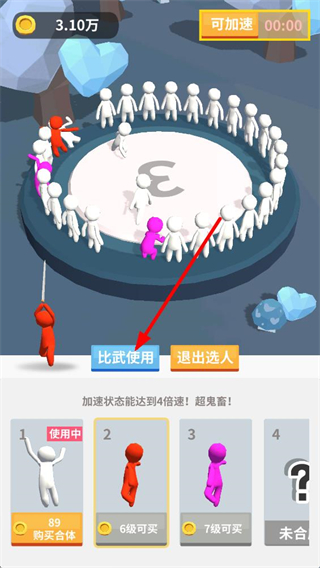 4、選擇已解鎖的角色后點擊比武使用,該角色會參與對局助力戰斗,加速狀態下合體速度可達4倍,能更快提升角色等級增強實力。