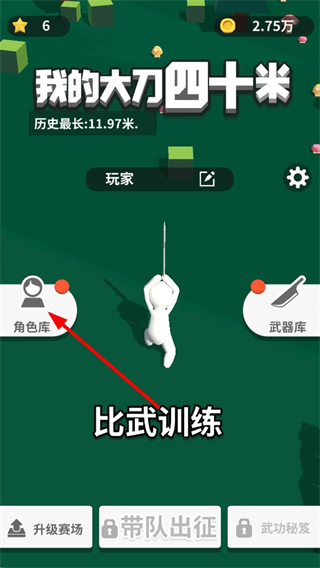1、進入游戲主界面可看到歷史最長刀長,還能通過角色庫、武器庫入口管理資源,點擊比武訓練可進入對局,同時可升級賽場提升玩法體驗。
