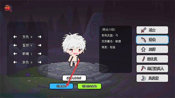 2、角色創建界面可選擇職業如游俠,常用武器為弓,優勢屬性敏捷,自定義外觀后點擊創建角色即可生成角色。