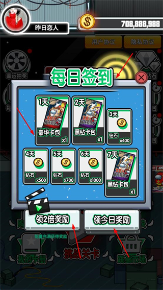1、每日進入簽到界面,點擊領今日獎勵,連續簽到獲取豪華卡包、黑鉆卡包等豐厚資源。