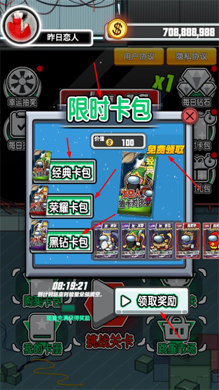 2、關注限時卡包活動,免費領取經典卡包,按需解鎖榮耀、黑鉆卡包,獲取強力卡牌。