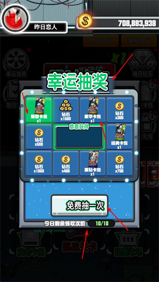 4、還可以參與幸運抽獎,每日用免費抽一次,有機會得卡包、鉆石,提升卡牌收集進度。