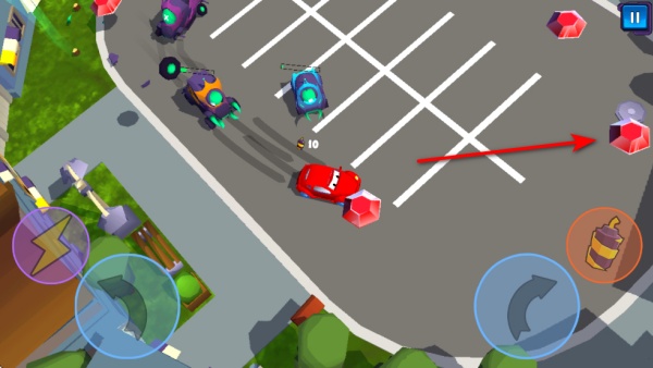 1、操控紅色賽車在場地中移動,收集場景里的寶石,同時避開敵方車輛的追擊,利用場地空間調整路線,持續收集資源積累優勢。