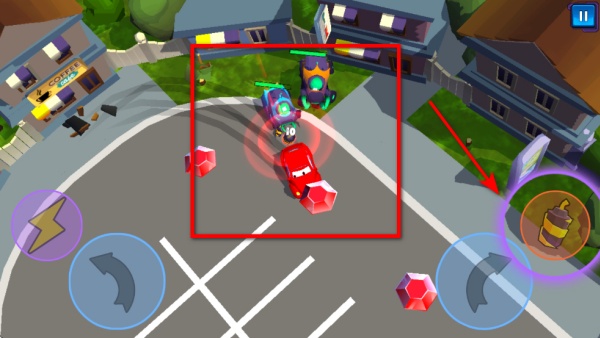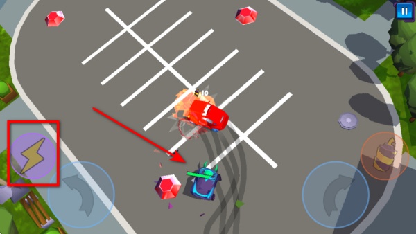 2、點擊左側閃電按鈕釋放技能,攻擊靠近的敵方車輛,命中后可擊退或擊敗對方,減少自身受到的威脅,維持安全的移動狀態。