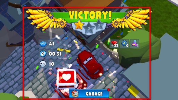 4、完成關卡目標后會顯示勝利界面,可查看通關時間和獲得的獎勵,點擊對應按鈕返回車庫,準備進入下一局游戲繼續挑戰。
