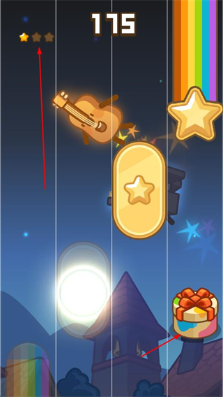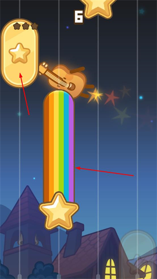 2、關卡過程可能會遇到彩虹條、星星等元素時,精準觸碰對應區域,積累星星進度條,提升連擊數與游戲得分。