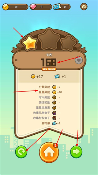 4、結算界面可查看最終分數與獎勵,點擊綠色按鈕重玩關卡,或者點擊按鈕返回主頁,積累資源解鎖更多游戲內容。