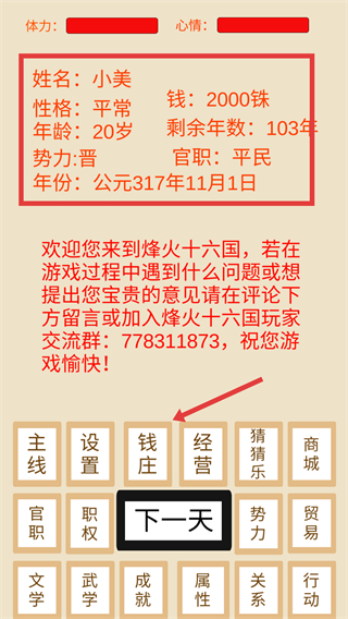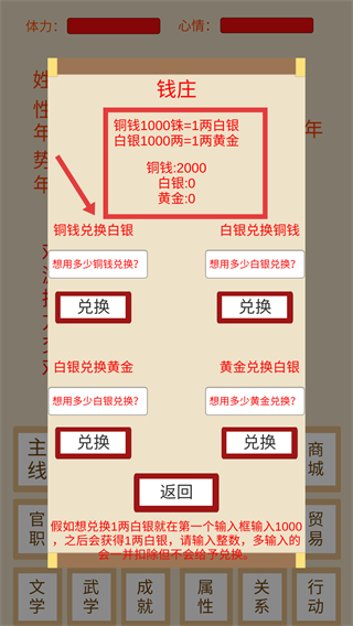 1、主界面點擊錢莊可兌換貨幣,同步更新角色狀態體力、心情游戲進程,是核心的時間推進操作。