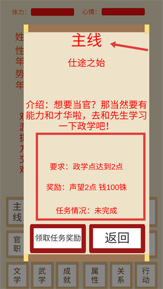 3、主線界面包含仕途之始任務,需將政學點提升至2點,完成后可獲得聲望2點、錢100銖的獎勵,是提升角色仕途的關鍵任務。