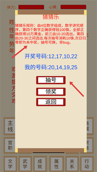 4、猜猜樂玩法需抽取4位數字號碼,與開獎號碼匹配可獲得獎勵如全對得10金,每次抽獎消耗10銖,是獲取額外資源的趣味玩法。