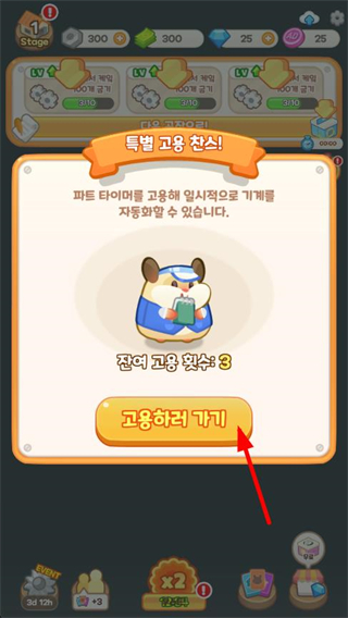 1、出現特殊雇傭機會彈窗,點擊去雇傭按鈕,可雇傭特殊倉鼠員工,借助其助力自動推進蛋糕生產流程。