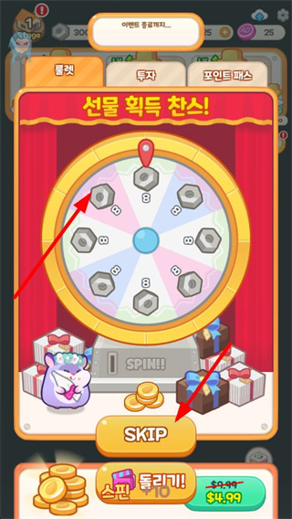 4、參與禮物獲取機會轉盤活動,點擊SPIN可轉動轉盤獲取螺母等道具,也能點擊SKIP跳過動畫,快速獲取獎勵。