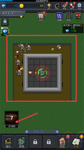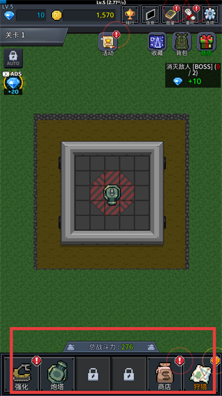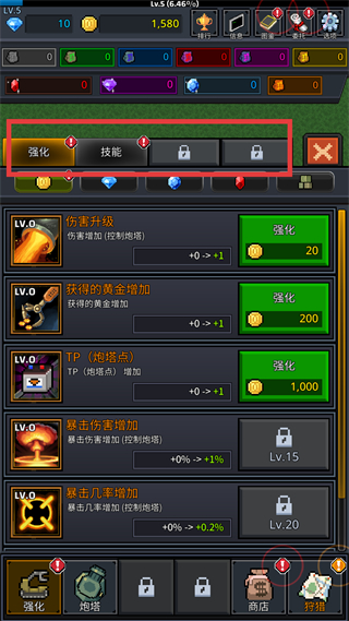 1、游戲界面底部功能欄含強化、炮塔等選項,先點擊強化按鈕,可進入炮塔屬性升級頁面,提升炮塔的攻擊能力,為后續攻擊敵人做準備。
