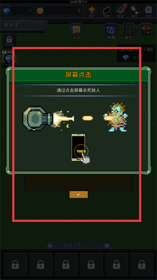 3、完成炮塔強化后,進入戰斗引導界面,根據提示點擊屏幕,即可觸發炮塔攻擊,通過點擊操作控制炮塔的攻擊時機,精準打擊進入射程的敵人。