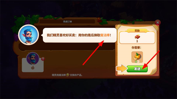 3、用南瓜與精靈交易獲取魔法棒,完成訂單任務,獲取獎勵,提升游戲資源儲備,解鎖新的交易和魔法玩法,繼續魔法世界冒險。