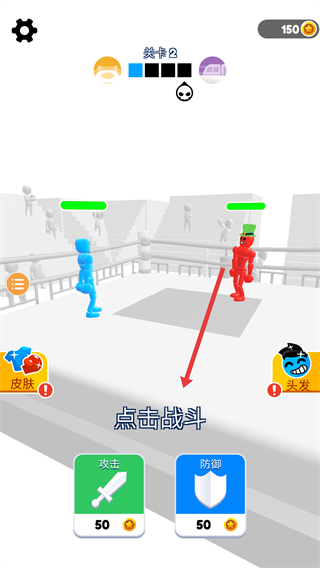 1、進入關卡2,界面顯示藍紅火柴人對戰,先點擊【點擊戰斗】,再按需選攻擊50金幣或防御50金幣,利用金幣消耗開啟戰斗流程。