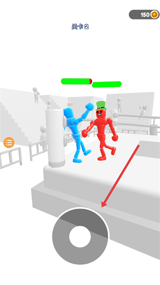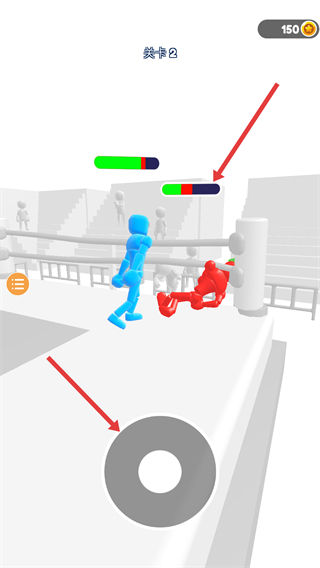 2、戰斗開始,藍紅火柴人近身互攻,通過下方圓形搖桿控制移動,靈活走位躲避紅方攻擊,尋找反擊時機,把控好搖桿操作節奏應對近戰。