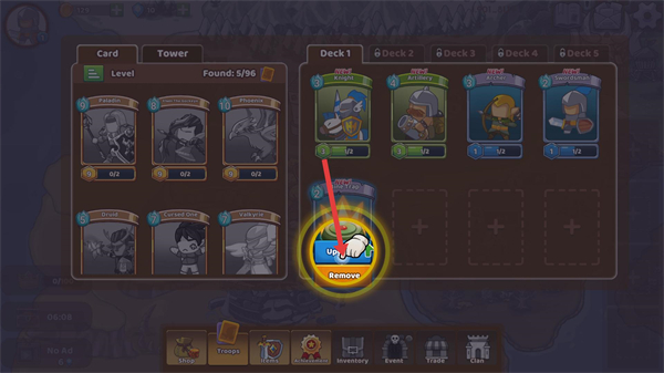 2、在兵種卡組界面,點擊Remove按鈕可移除當前卡組中的兵種,便于替換為更適配關卡的作戰單位。