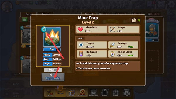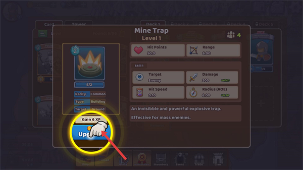 3、選擇兵種后,點擊Up按鈕可消耗資源提升其等級,增強該陷阱對集群敵人的殺傷效果。