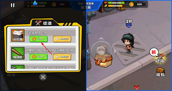 4、進入建造功能頁面,看到補給箱選項需消耗300金幣,點擊對應的按鈕完成建造,準備開展后續的游戲生存操作。