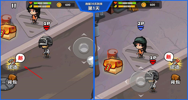 3、進入首日雙角色主界面,看到資源數值及建造按鈕,點擊該按鈕,進入包含補給箱棒球棍等選項的建造功能頁面。