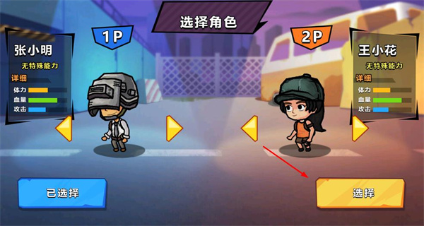 2、進入角色選擇頁面,看到1P已選張小明,點擊2P對應的選擇按鈕,選定王小花作為角色,進入游戲首日的雙角色主界面。