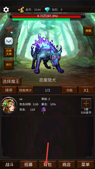 1、點擊底部背包按鈕進入背包界面,這里可管理角色裝備,是提升角色戰力的核心操作入口。