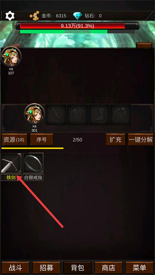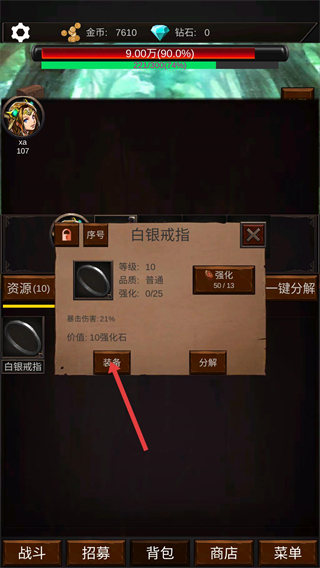 4、選擇白銀戒指后點擊裝備,可穿戴該武器,進一步強化角色屬性,提升戰斗能力。