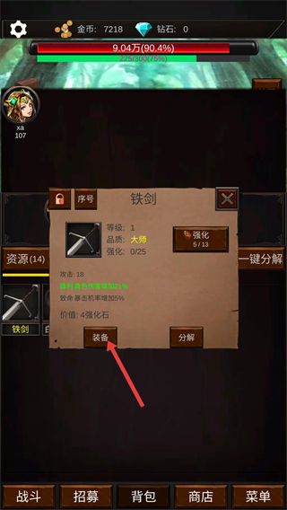 2、在背包資源欄選擇裝備如鐵劍,點擊后可查看裝備詳情,為后續穿戴或強化做準備。