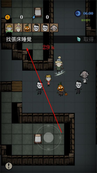 3、進入關卡場景后,查看界面提示的找張床睡覺任務,觀察場景內的角色與床的位置,規劃移動路線向目標床靠近。